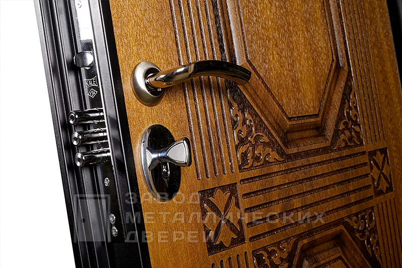 Для частного дома и коттеджа важна не только прочность, но и вид с порога. Здесь обе стороны закрыты панелями из натурального дерева: светлый тон делает вход парадным, а фактура остаётся живой и тёплой, но на стальной основе. Кованый декор и стеклопакет добавляют воздуха и статуса, при этом дверь рассчитана на уличную установку и спокойно переносит капризы погоды. У железной двери для наружной установки светлых панелей №9 можно выбрать левое или правое открывание, наружное либо внутреннее. В запирании — сувальдный Просам и цилиндровый Мосрентген, оба с тремя ригелями: закрывается без театральных пауз. По желанию ставим Guardian, Border, Cisa, Kale Kilit, Эльбор, Mottura или умный электронный замок, делаем доборы и наличники в цвет и можем добавить видеодомофон. Железная дверь для наружной установки светлые панели №9 по выгодной цене с доставкой и установкой в от производителя.
